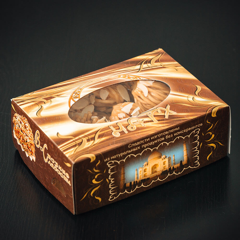 Состав: обжаренный полуфабрикат (мука пшеничная в/с, вода питьевая, масло подсолнечное, сахар песок, кислота лимонная, разрыхлитель (сода пищевая), соль), медово-сахарный сироп (мед натуральный, сахар-песок), миндальные лепестки.